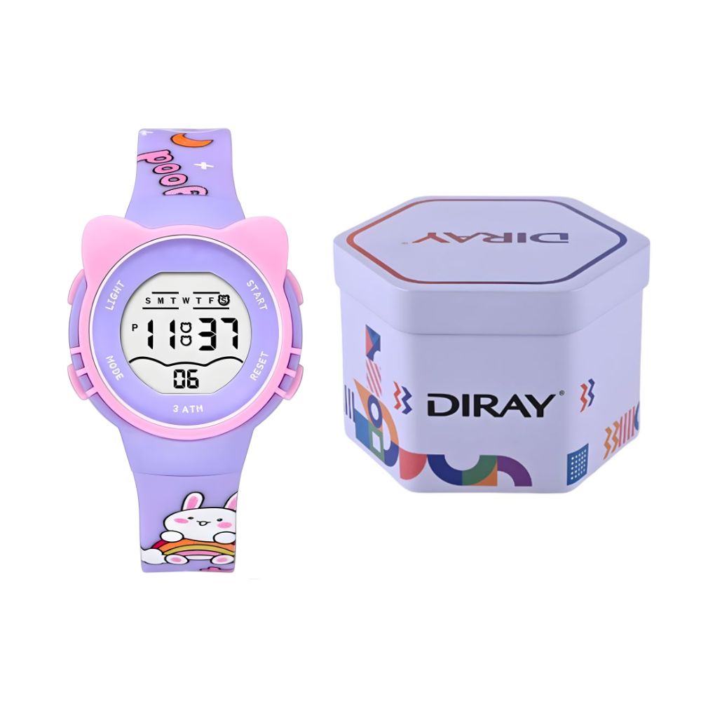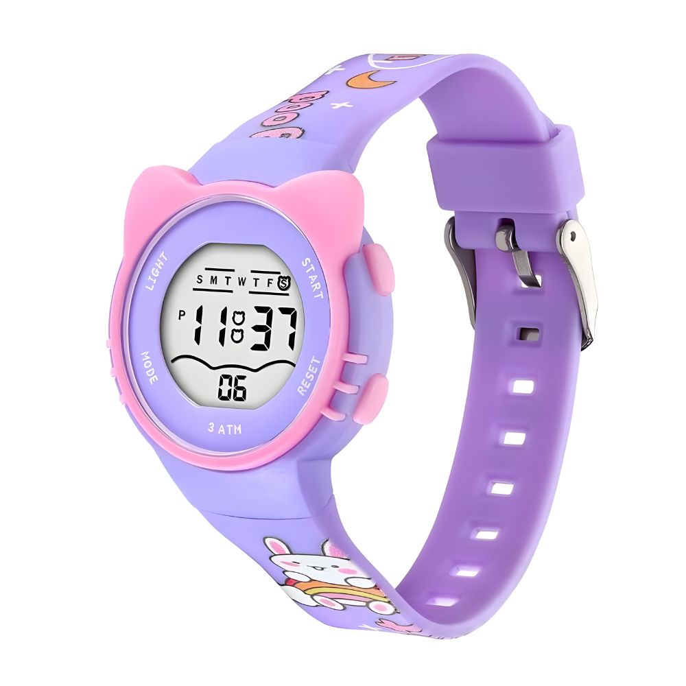 Reloj digital con correa de plástico en color lila y detalles rosa, el accesorio ideal para una niña audaz y moderna.