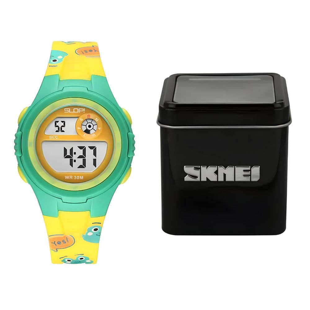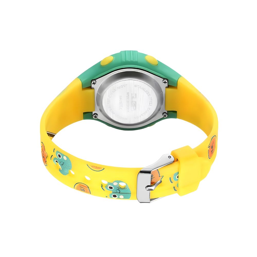 Reloj digital con correa de plástico en color amarillo y detalles verde, el accesorio ideal para un niño audaz y moderno.